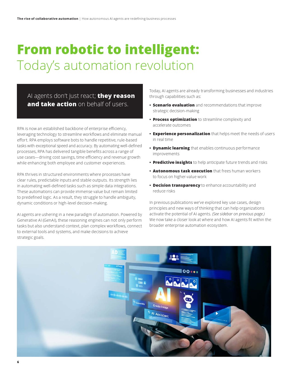 自动化正经历从“规则执行”向“认知决策”的结构性跃迁。报告指出,过去十年RPA在企业中承担了核心效率工具角色,通过处理规则明确、流程稳定的任务,实现成本下降与效率提升。然而,随着业务复杂度提升,传统自动化在非结构化数据处理、动态环境适应及复杂决策方面的局限日益显现,成为企业进一步提效的关键瓶颈。AI代理的出现,标志着自动化从“工具层”迈入“系统层”,其核心价值在于通过理解上下文、动态学习与自主决策,重构业务流程逻辑。