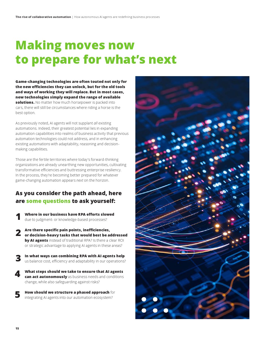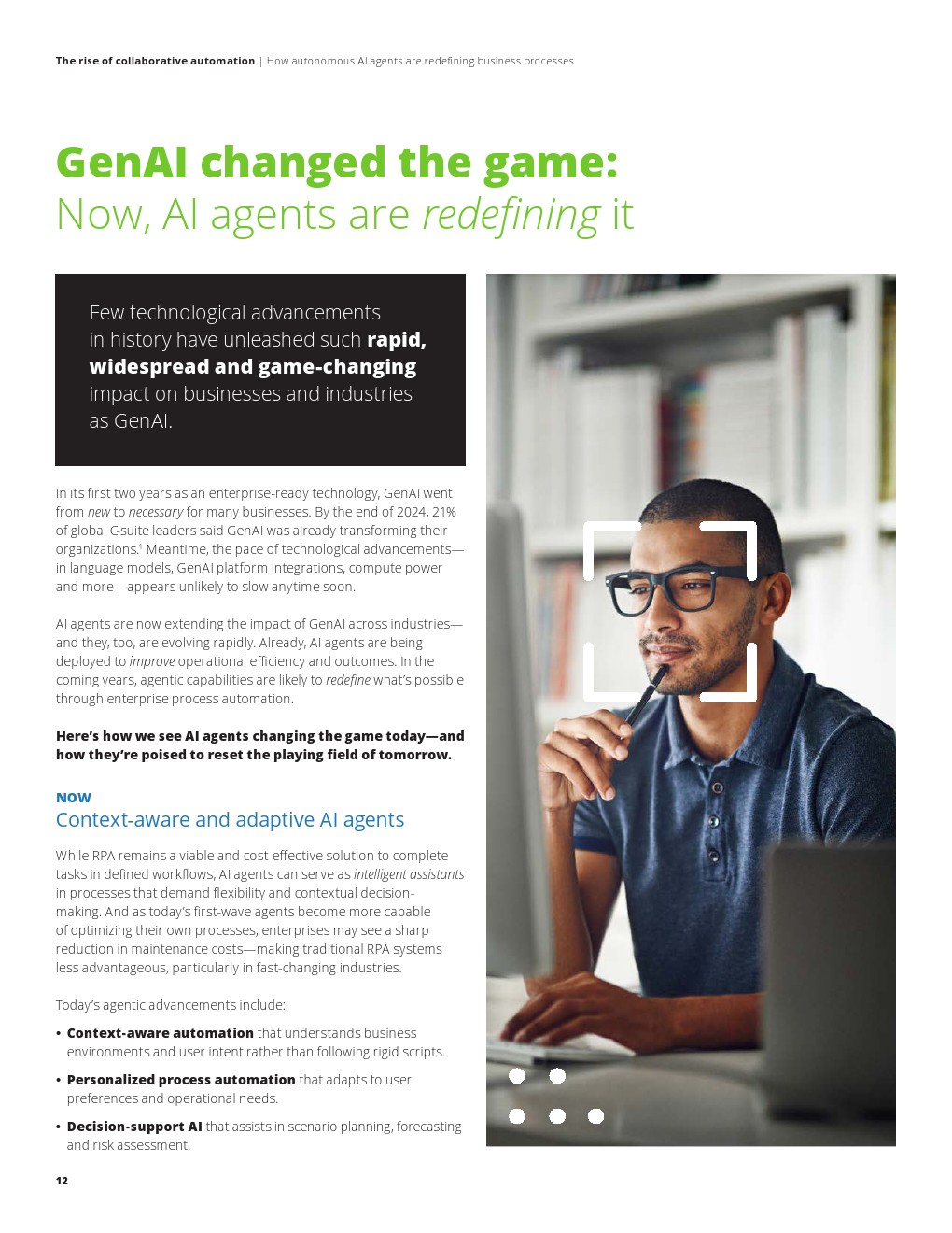 从市场渗透看,生成式AI的快速扩张正在加速这一转型进程。数据显示,截至2024年底,已有21%的全球高管认为生成式AI正在实质性改变企业运营模式。在此基础上,AI代理进一步放大技术红利,使自动化从执行层深入到决策层。报告预计,未来6至12个月,多代理协同系统将逐步成熟,推动跨流程、跨部门的自动化整合,并显著降低人工干预比例。