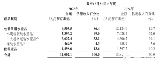 从产品来看,华润饮料支柱业务包装饮用水产品2025年实现收入95.04亿元,较2024年的121.24亿元下降21.6%,营收占比也下降至86.4%。而饮料产品收入同比增长7.3%至14.98亿元,但仅占总收入的13.6%,对业绩的影响作用有限。