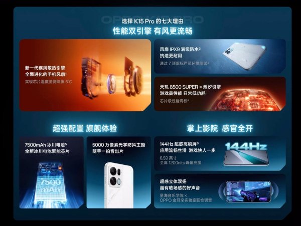 OPPO K15 Pro系列搭载的新一代疾风散热引擎,在散热效率、体积控制、耐用性、静音表现等多个维度全面领先。该引擎全新升级低阻风道并创新散热架构,行业首发新一代疏密错位散热鳍片,配合超大面积「手撕钢」VC以及超高导热率石墨凝胶,整机散热效率大幅提升,可有效缓解重度使用场景下的设备发热问题。