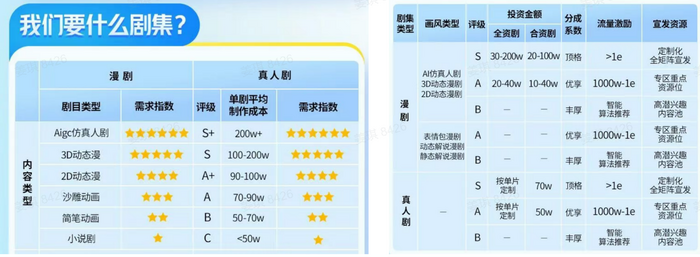 在合作方式上,快手提供了两种路径。一种是“快手制片+合作方承制”模式,适用于缺乏自有IP和初始资金的中小工作室,快手提供IP、创意方向、全额投资,合作方按件计费或赚取承制费,知识产权归快手所有。另一种是“按比例投资共创”模式,面向拥有爆款IP资产、有历史成功数据的成熟MCN或承制方,快手按S级或A级评级支付部分制作费用,合作方带资进组,双方按比例共享知识产权。两种模式的区别在于,前者是平台主导的内容采购与生产外包,后者是平台与优质内容方的资产合资。