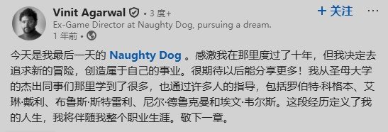 阿加瓦尔为顽皮狗效力十年后于去年1月离开单位去日本创立自己的工作室,他在声明中提到的五位老将如今仅剩尼尔一人还留在顽皮狗: