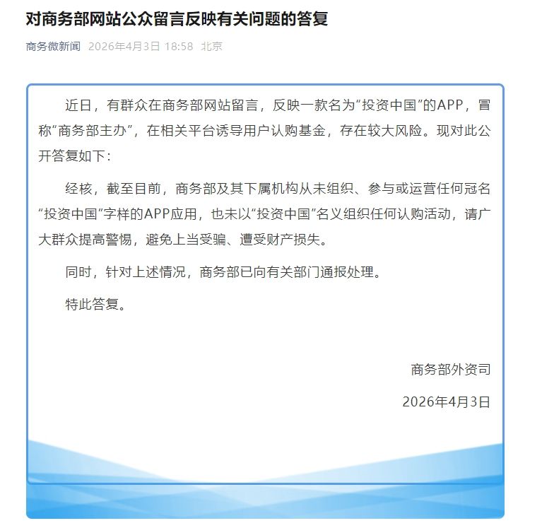 近日,有群众在商务部网站留言,反映一款名为“投资中国”的APP,冒称“商务部主办”,在相关平台诱导用户认购基金,存在较大风险。现对此公开答复如下: