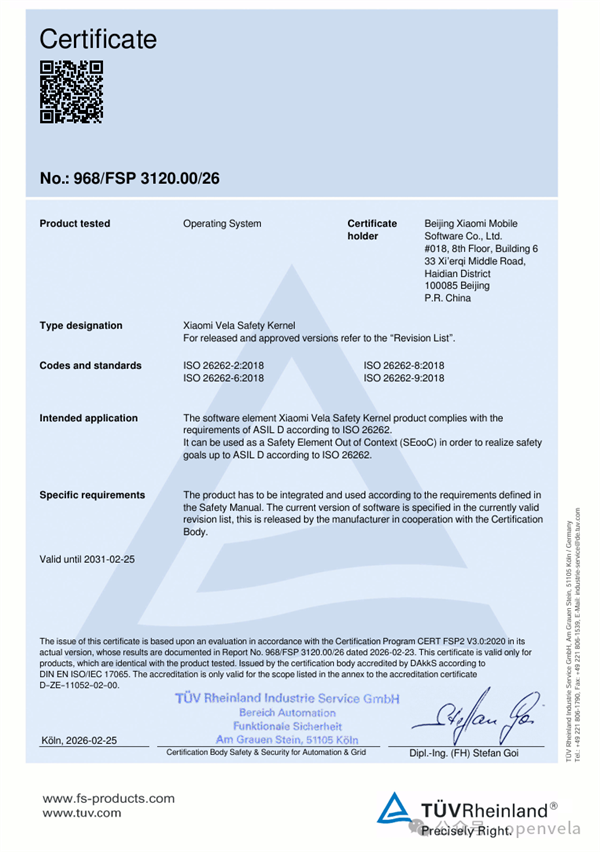 本次认证过程中,小米团队依托完善的功能安全管理体系,历经多轮交付件专项评审、认证机构现场核验与专家终审,全程严格遵循标准要求,顺利通过全部考核环节,充分印证了Xiaomi Vela Safety内核的硬核技术实力。