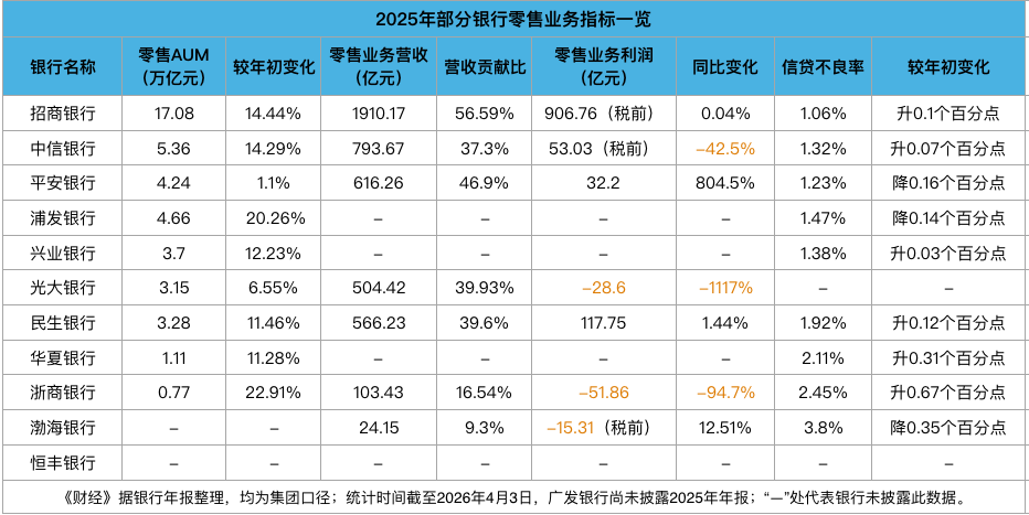 截至4月2日,多数大中型银行已披露2025年年报。从《财经》统计的6家国有银行和11家全国性股份制银行(截至发稿前,广发银行尚未披露)年报数据来看,零售AUM(资产管理规模)普遍上升,营收整体保持相对稳定,但零售 务利润 依然 承压 不良率多数走高。在已披露可比数据的12家银行中,3家零售业务亏损;6家利润同比负增,最高幅度达-1117%。