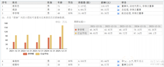 此外,李学辉2021年至2025年薪酬分别为48.36万元、43.92万元、46.18万元、79.18万元、85.38万元,薪酬已连续四年保持增长趋势。而其2025年薪酬也高于鹿游,后者2025年薪酬为68.22万元。