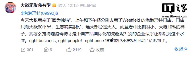 他表示,“今天大致看完了‘因为独特’,上午和下午还分别去看了 Westfield 的泡泡玛特门店。门店只有大概 60 平米,生意确实很好,绝大部分是大人,而且老中比例很小,大概 10% 的样子。我怎么觉得泡泡玛特才是中国产品国际化的先驱呢?别的企业似乎还都没到这个水准。right business, right people!right price 很重要也不常见但似乎又见到了。”