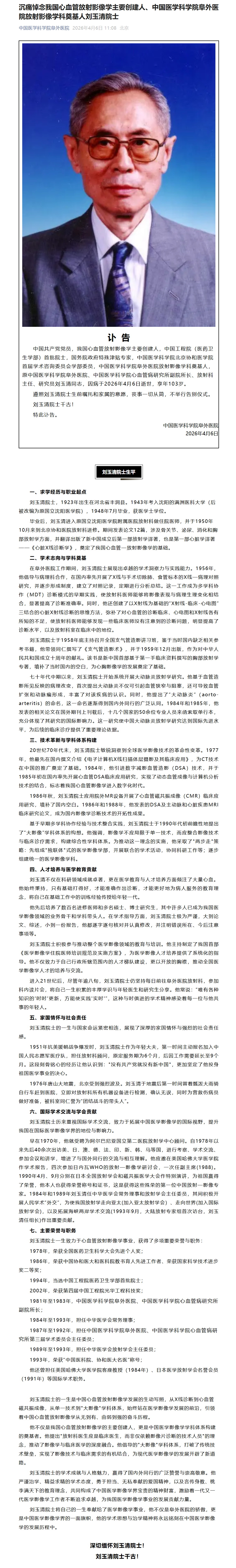 IT之家 4 月 6 日消息,中国医学科学院阜外医院今日发布讣告,我国心血管放射影像学主要创建人、中国工程院(医药卫生学部)首批院士、国务院政府特殊津贴专家、中国医学科学院阜外医院放射影像学科奠基人刘玉清同志,因病于 2026 年 4 月 6 日逝世,享年 103 岁