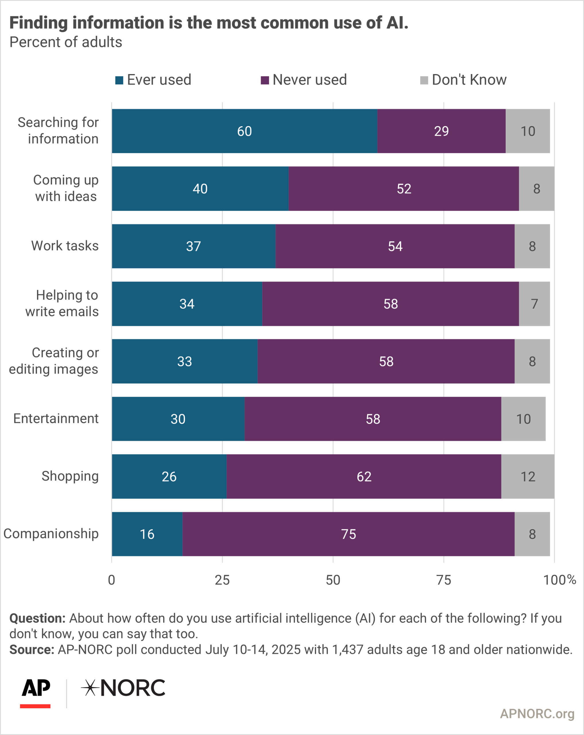 当前人工智能的普及呈现出明显的结构性特征。根据AP-NORC最新调查,约60%的美国成年人曾使用AI进行信息搜索,这一比例在所有使用场景中居于首位,显示AI已在信息获取环节形成基础性渗透。同时,约40%的用户将AI用于工作任务或创意生成,约三分之一用于写邮件、图像处理及娱乐,约四分之一用于购物,反映出AI从工具属性逐步向多场景扩展,但整体仍集中在效率辅助层面。