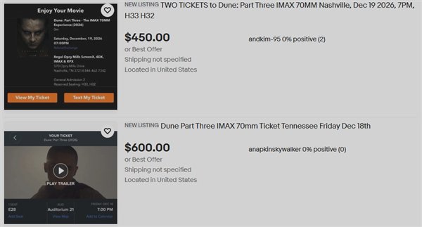 上述场次的入场券于美东时间6号中午上线开售,数分钟内售完。eBay黄牛随即活跃起来,加价转卖的电影票最便宜也要450美元(非首映,非最佳观影位):