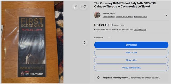 同样是高端场次的好莱坞TCL中国剧院《奥德赛》IMAX首映电影票最贵可以卖到600美元: