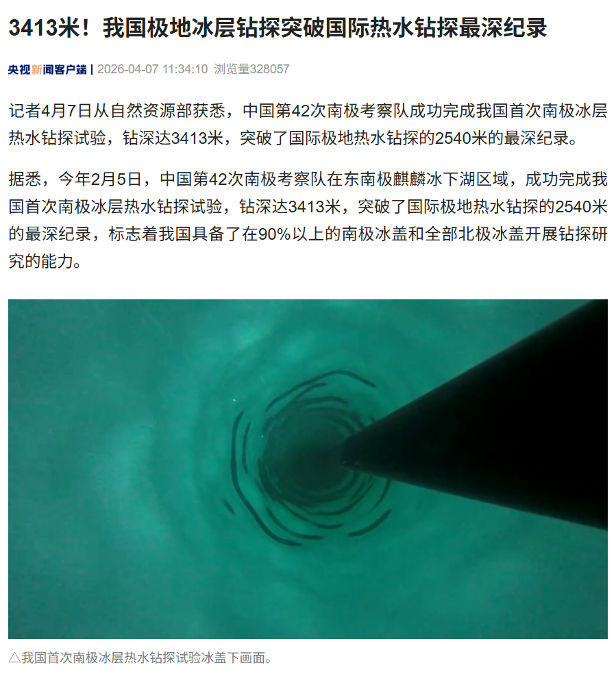 据悉,今年 2 月 5 日,中国第 42 次南极考察队在东南极麒麟冰下湖区域,成功完成我国首次南极冰层热水钻探试验,钻深达 3413 米,突破了国际极地热水钻探的 2540 米的最深纪录,标志着我国具备了在 90% 以上的南极冰盖和全部北极冰盖开展钻探研究的能力。