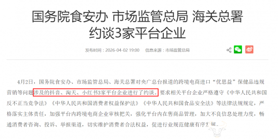 据市场监管总局4月2日发布的公告显示,抖音此次被国务院食安办、市场监管总局、海关总署约谈,主要涉及跨境电商进口“优思益”保健品违规营销等问题,被要求“加强平台内跨境电商企业审核把关,强化平台内在售商品管理”。