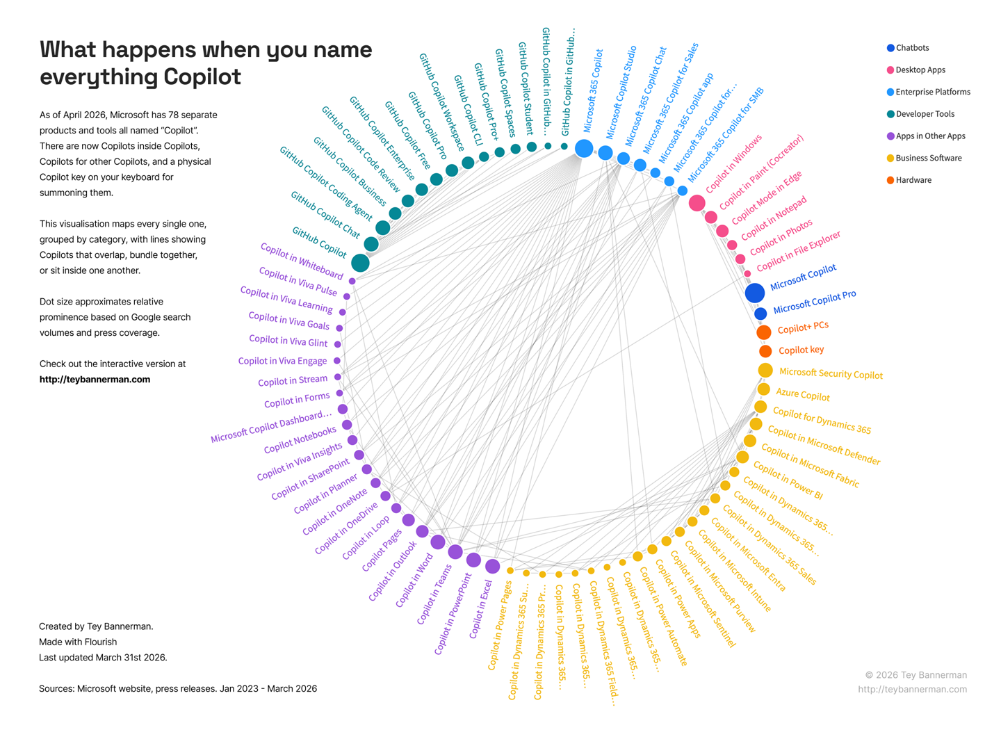 IT之家 4 月 7 日消息,AI 顾问 Ty Bannerman 于 3 月 31 日梳理发现,微软以“Copilot”命名的产品数量已达 80 款,涵盖应用、功能及硬件键等。