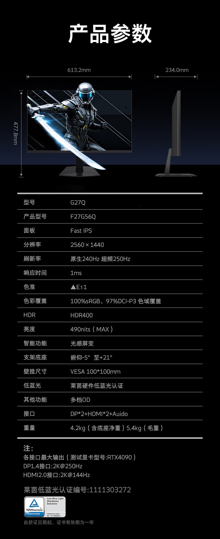 该机配备一块 2560×1440 分辨率 250Hz 超频(原生 240Hz)Fast IPS 面板,显示器亮度 490 尼特,GtG 响应速度 1ms,覆盖 100% sRGB、97% DCI-P3 色域。