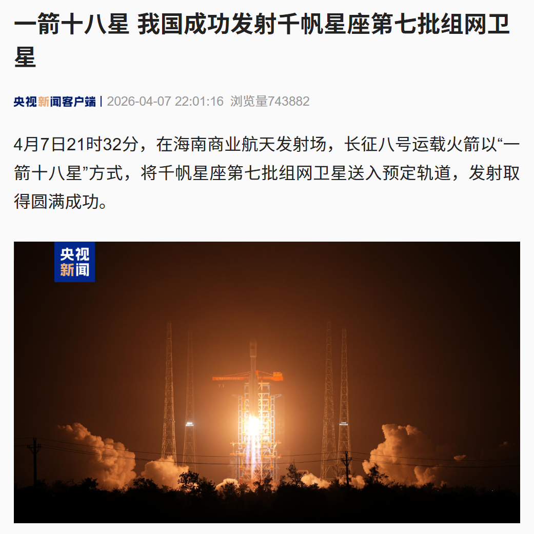 IT之家 4 月 7 日消息,据央视新闻报道,今晚 21 时 32 分,在海南商业航天发射场,长征八号运载火箭以“一箭十八星”方式,将千帆星座第七批组网卫星送入预定轨道,发射取得圆满成功。