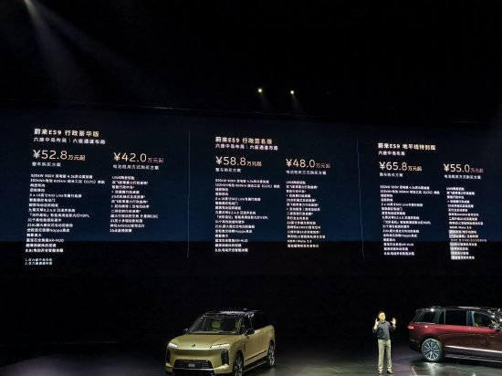 <p> 新浪科技讯 4月9日晚间消息,蔚来ES9今日正式发布并开启预售,定位科技行政旗舰SUV。ES9行政豪华版预售价52.8万元起,采用BaaS电池租用方式购买,预售价42万元起;行政签名版预售价58.8万元起,采用BaaS电池租用方式购买,预售价48万元起;地平线特别版预售价65.8万元起,采用BaaS电池租用方式购买,预售价55万元起。</p>