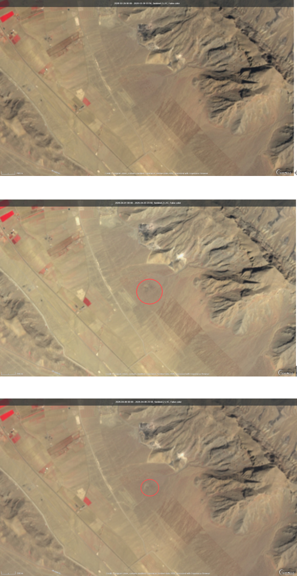 上:谷歌地球:32°22’52.5″N 51°40’19.6″E,下:塔斯尼姆通讯社公布的坠机现场图片。使用欧盟实时卫星工具Copernicus Browser,将地点锁定至上述坐标,对比3月29日、4月3日和4月6日拍摄的图像,可以观察到,4月3日后该地地表出现了一个较为明显的深色印记,该印记与东北侧山脉的相对位置与塔斯尼姆通讯社公布的画面中央战机坠毁后形成的黑色深坑的位置相符。