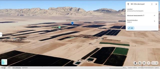 在谷歌地球上搜寻伊斯法罕省南部的戈壁地貌,结合山脉走向,可以确认网传图像的拍摄地点在32°14’57.59″N 51°53’55.80″E附近,此地南侧约3km范围内有一条农用跑道。这与美方披露的两架MC-130J特种运输机在“临时沙地跑道”上降落开展救援的说法相符。