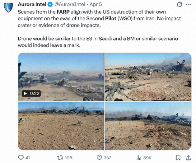 同时间,社交平台上出现了多张展现美军战机被摧毁后的图片,此外还有多段展示美军救援机出现在伊朗上空的视频。