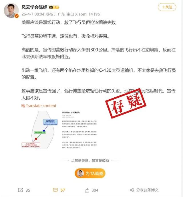 有网友对美军的救援行动质疑,认为所谓的救援行动实为“窃取浓缩铀的掩护行动”,理由是“美军宣称的飞行员坠机地点与实际军事行动地点相距约400公里”,而最终行动的地点“距离伊斯法罕核相关设施仅数英里”。