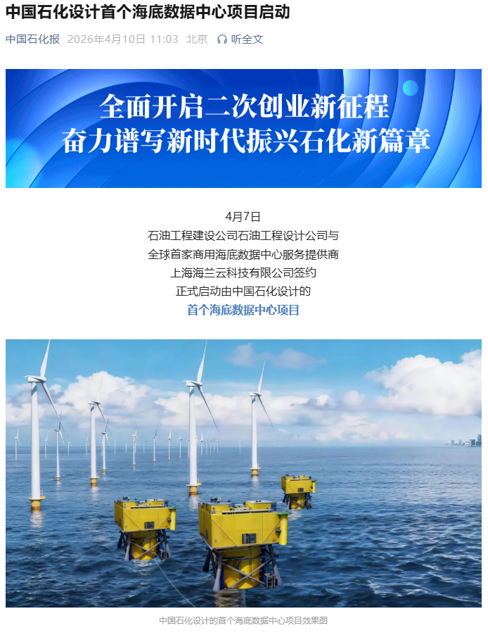 IT之家 4 月 10 日消息,据中国石化报,4 月 7 日,石油工程建设公司石油工程设计公司与全球首家商用海底数据中心服务提供商上海海兰云科技有限公司签约,正式启动由中国石化设计的首个海底数据中心项目。