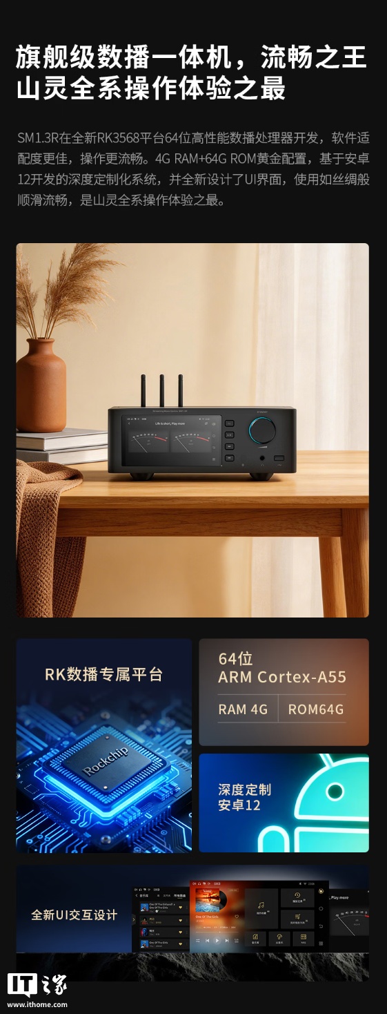 IT之家 4 月 10 日消息,山灵 SM1.3R 流媒体数播解码一体机现已开启预约,新品主打昆仑 Pro R2R 解码阵列,配备 Rockchip 处理器、Android 12 操作系统,到手价 8998 元
