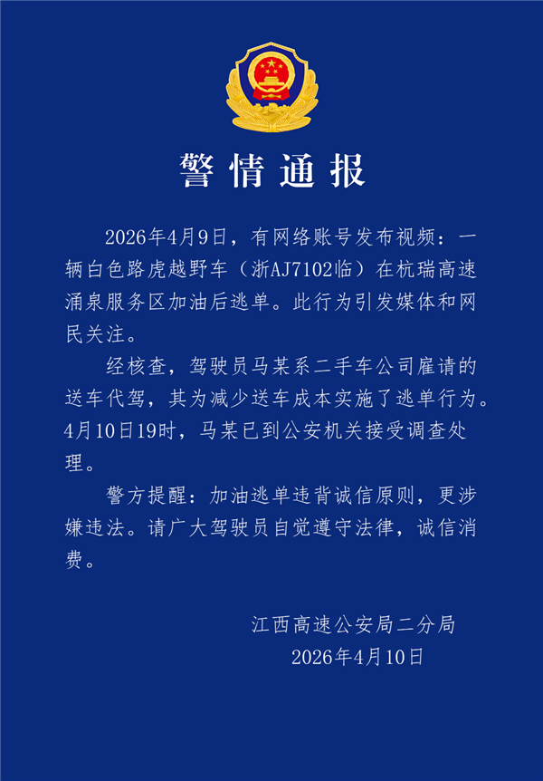 2026年4月9日,有网络账号发布视频:一辆白色路虎越野车(浙AJ7102临)在杭瑞高速涌泉服务区加油后逃单。此行为引发媒体和网民关注。