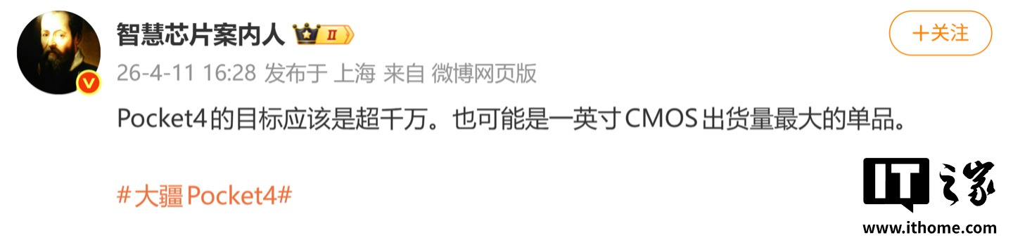 IT之家 4 月 11 日消息,博主 @智慧芯片案内人 今天在微博透露,Pocket 4(大疆 Pocket 4)的目标应该是超千万,也可能是一英寸 CMOS 出货量最大的单品。