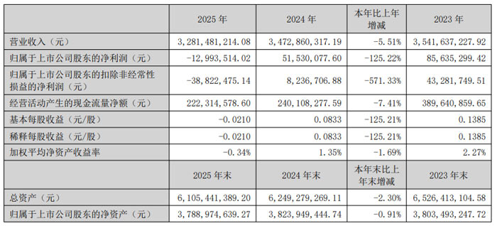 2025 年,受下游传统领域市场需求减弱、原材料价格上涨等多重因素影响,公司经营业绩呈现阶段性调整。全年实现营业收入 32.81 亿元,同比下降 5.51%;归属于上市公司股东的净利润-1299.35 万元,同比下降 125.22%;归属于上市公司股东的扣除非经常性损益的净利润-3882.25 万元,同比下降 571.33%。