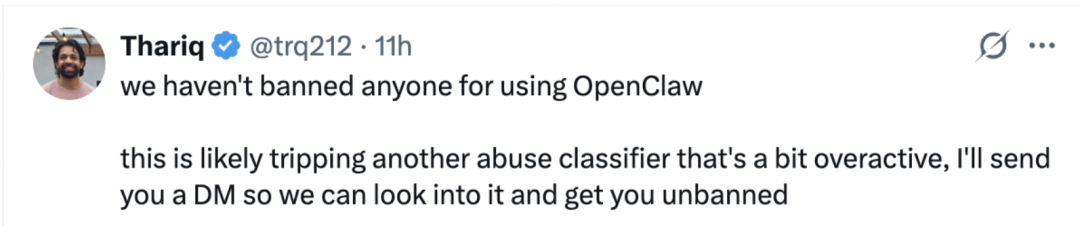 随着帖子热度的高涨,之后,Anthropic 的一位工程师 Thariq Shihipar 也「入场」了。他表示, 「我们并没有因为使用 OpenClaw 而封禁任何人。这很可能是触发了另一个有点过于敏感的滥用检测分类器。我会给你发私信,我们一起看看情况,帮你解除封禁。」