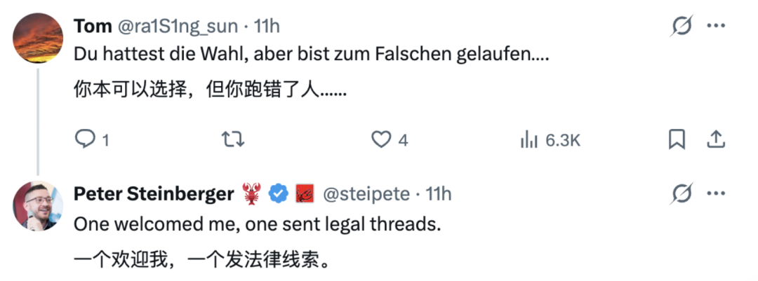 Peter Steinberger 也是毫不犹豫地反击: 「他们一个欢迎我,一个发法律函……」