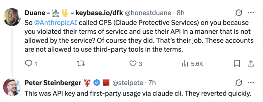 也不知道到底是不是 Thariq Shihipar 的帮忙,还是本身这次的「封禁」就只是个乌龙,总之,在「封禁」两个小时之后,Peter Steinberger 的账号就得到了恢复。