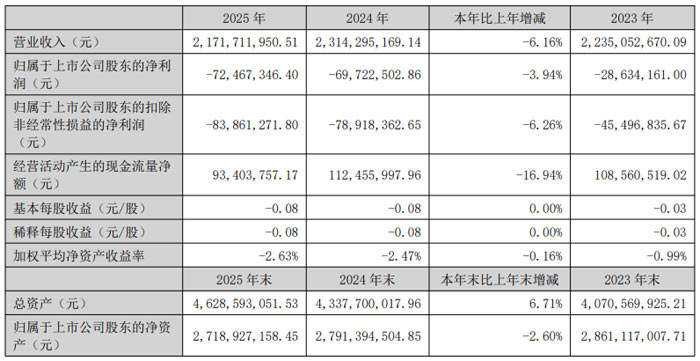 2025 年,受薄膜行业供需失衡、传统产品价格竞争加剧等因素影响,公司经营业绩承压。全年营业收入21.72 亿元,同比下降6.16%;归属于上市公司股东的净利润 -0.72 亿元 ,同比下降3.94%;扣除非经常性损益后的净利润 -0.84 亿元 ,同比下降6.26%。