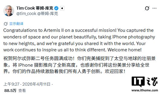 库克写道:“你们精彩捕捉了太空与我们星球的壮美,将 iPhone 摄影推向了新高度,我们十分感谢你们与全世界分享这份画面。你们的事业不断激励着我们所有人勇于创新。欢迎回家!”