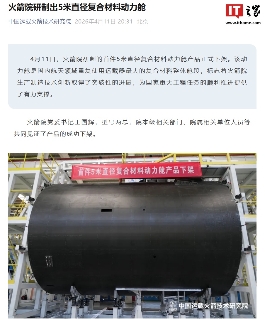 IT之家 4 月 12 日消息,据中国运载火箭技术研究院昨晚分享,火箭院研制的首件 5 米直径复合材料动力舱产品正式下架。