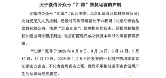 声明中表示,微信公众号“汇源”(认证主体:北京汇源食品饮料有限公司)此前受无关人员控制,近段时间账号运营处于非公司管理控制的状态。经公司积极维权并经由司法程序判定,北京汇源现已成功恢复本账号的运营管理权限。