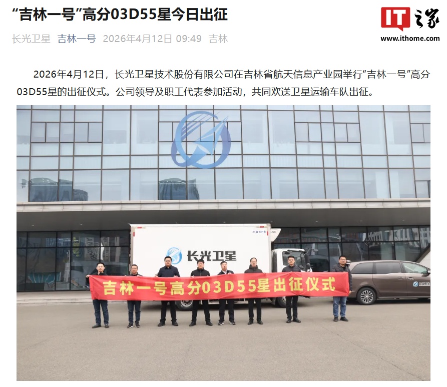 IT之家 4 月 12 日消息,据长光卫星官方消息,“吉林一号”高分 03D55 星今日出征,长光卫星技术股份有限公司还在吉林省航天信息产业园举行了该星的出征仪式。