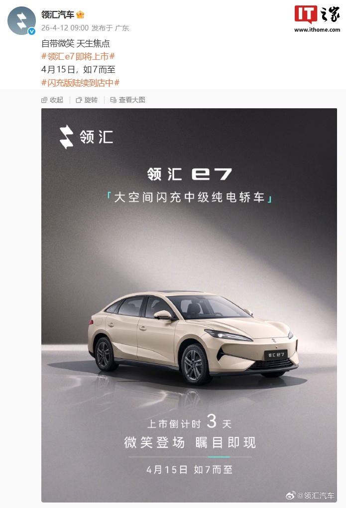 IT之家 4 月 12 日消息,比亚迪领汇汽车今日宣布,领汇 e7 将在 4 月 15 日上市。新车定位“大空间闪充中级纯电轿车”,目前闪充版陆续到店中。