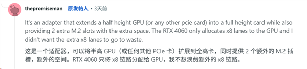 快科技4月12日消息,近日有用户分享了自己RTX 4060半高显卡的改装经历,只需一款售价27美元(约184元人民币)的PCIe转接卡,就能同时实现两项功能:
