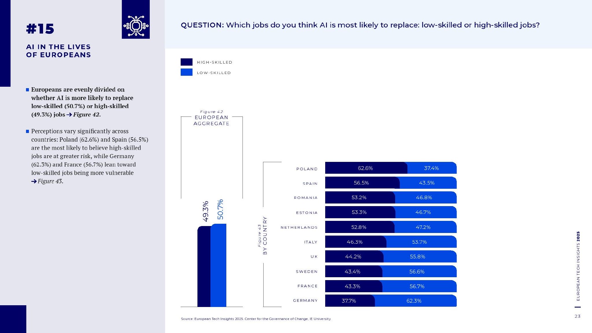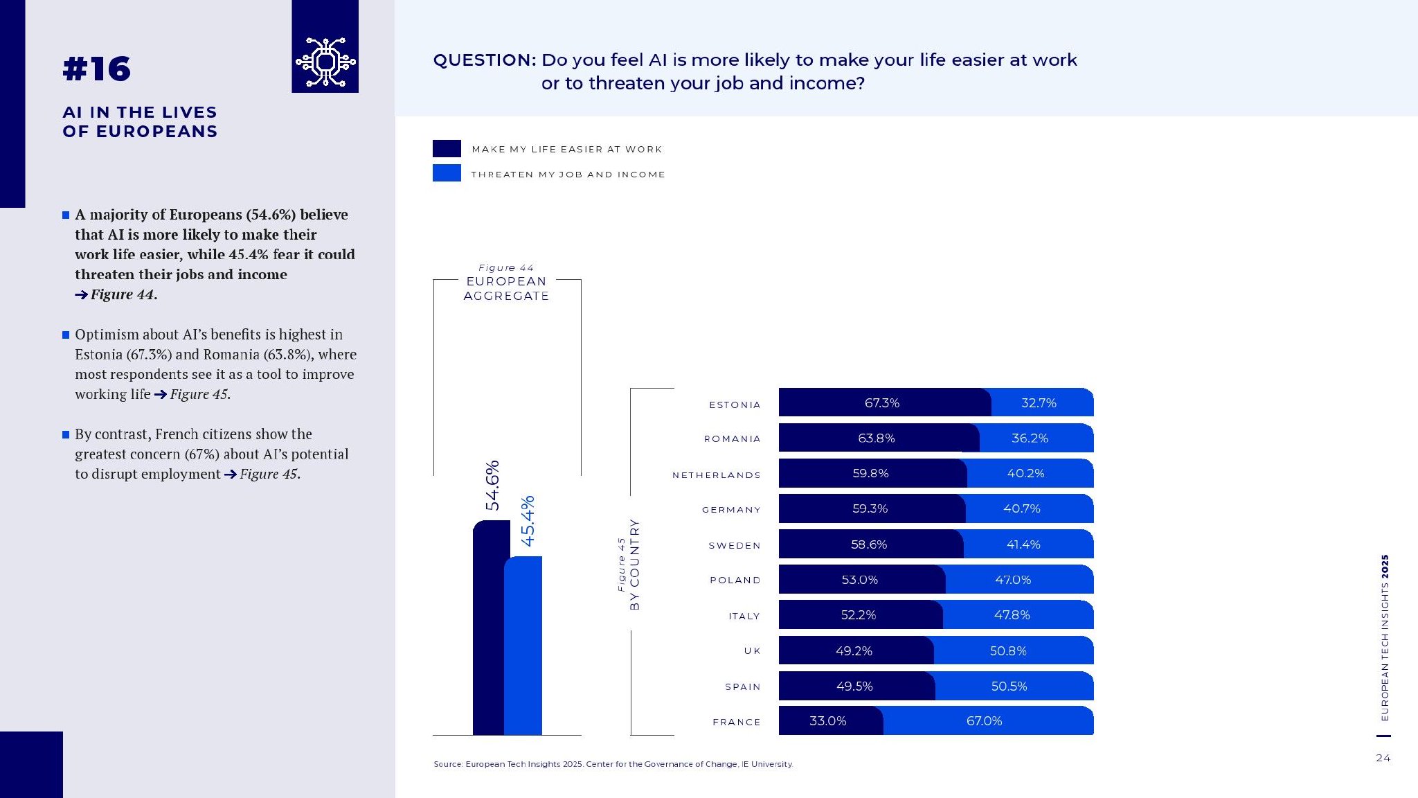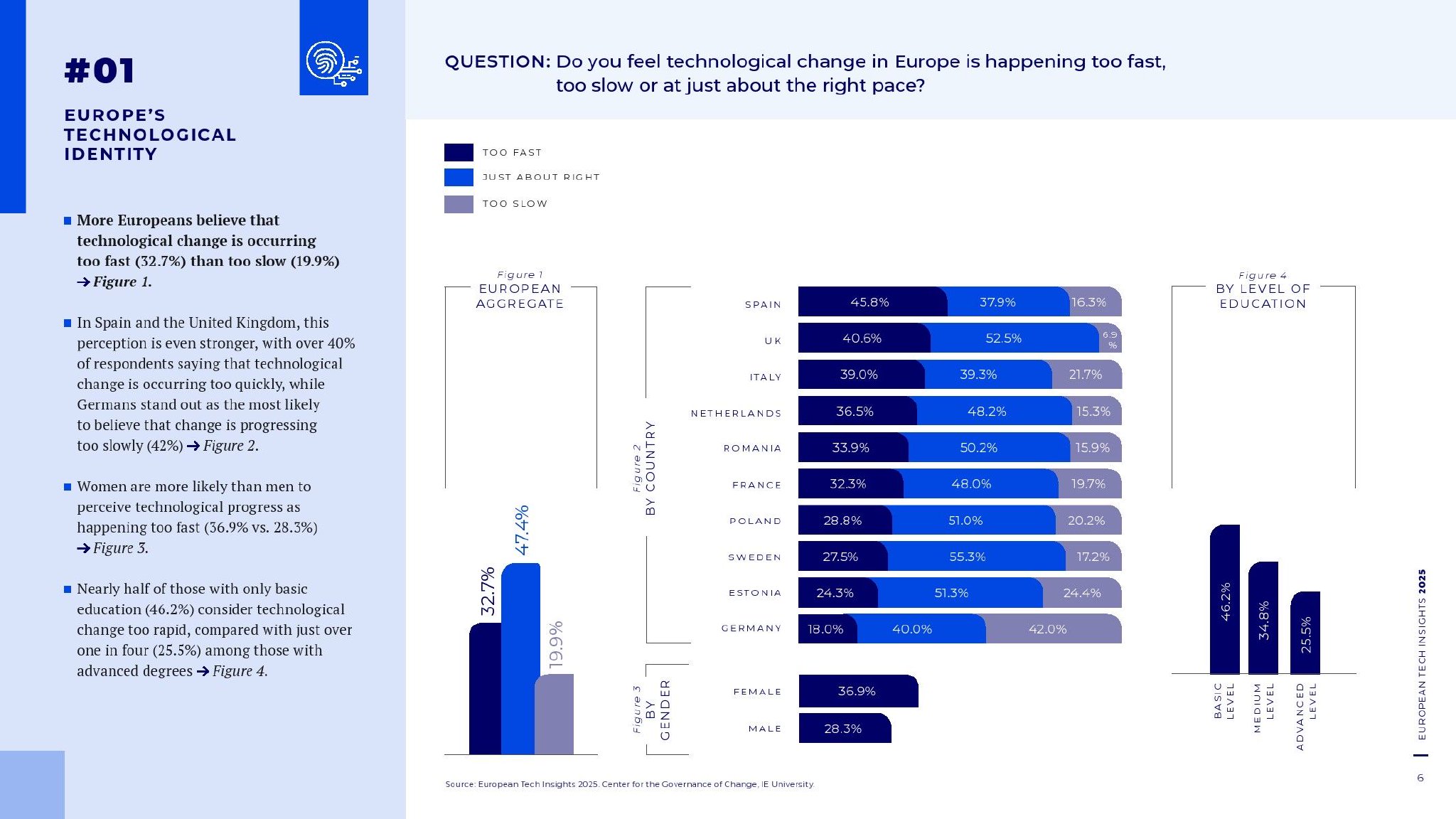 这种审慎态度同样体现在对技术变革速度的感知上。32.7%的欧洲人认为技术发展过快,而仅19.9%认为过慢 。教育程度越低,对“过快”的感知越强,基础教育群体中这一比例高达46.2% 。此外,48.5%的受访者认为技术将使人与人更加疏远 。这一结构性分歧意味着,技术扩散正在加剧社会心理的不均衡,而非单向提升整体福祉。