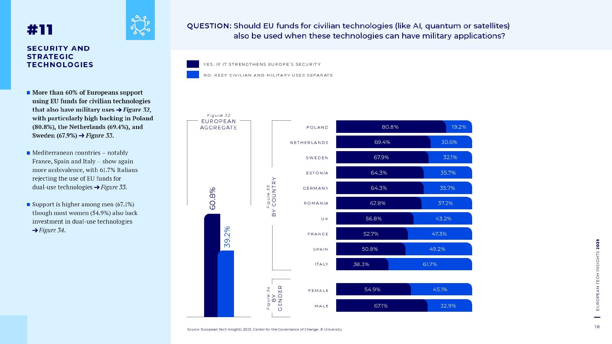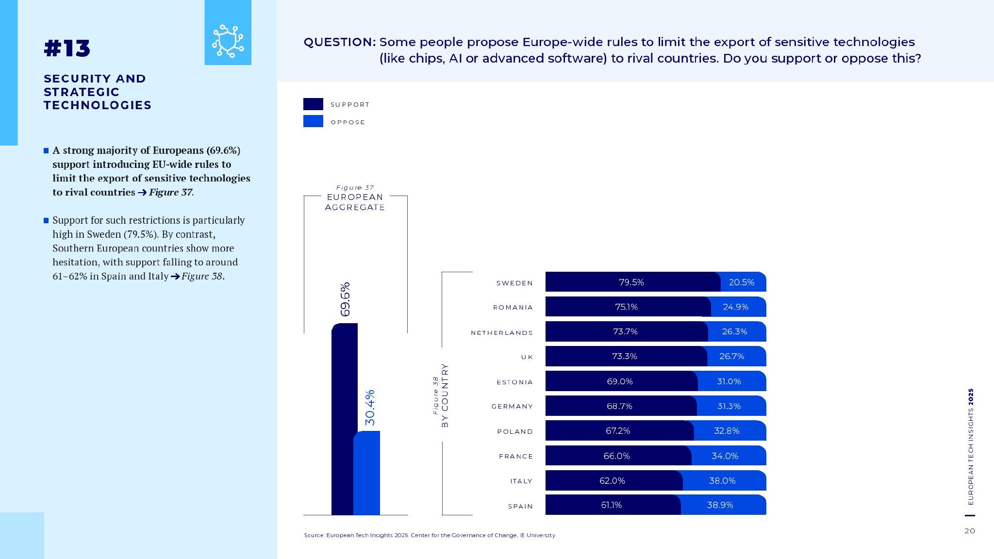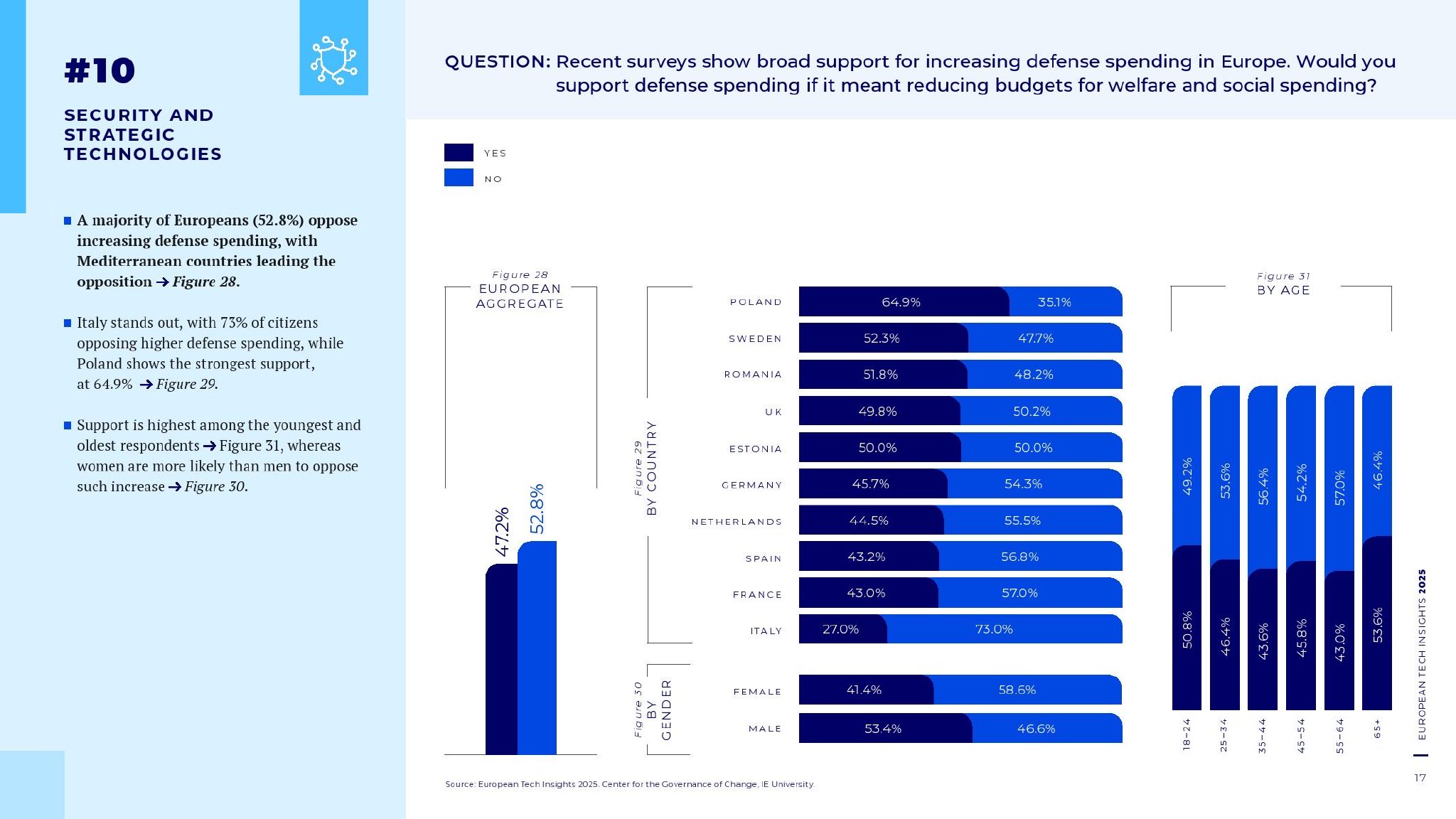 技术主权意识显著增强。63%的欧洲人愿意为本土安全技术支付更高价格,72.3%支持敏感数据仅存储于欧洲服务器 。此外,69.6%支持限制敏感技术出口 。然而,在财政取舍上仍存在矛盾,仅47.2%支持增加国防开支,且以削减社会支出为代价时反对比例升至52.8% 。这表明“战略自主”虽成为共识,但其成本分担尚未获得完全社会授权。