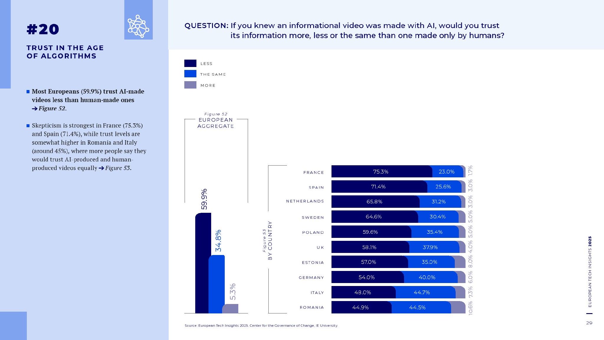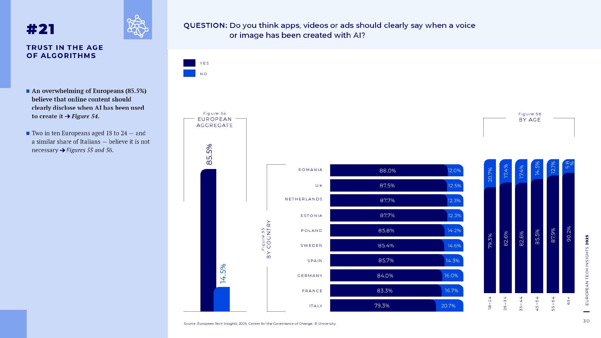 算法社会的信任问题进一步加剧。59.9%的欧洲人对AI生成内容信任度更低,85.5%要求明确标注AI生成信息 。同时,66%担忧算法导致文化同质化,56.9%认为推荐系统更倾向于推送“流行内容”而非真实偏好 。这意味着,数字平台的分发机制正被视为潜在的社会结构性风险,而非中性工具。
