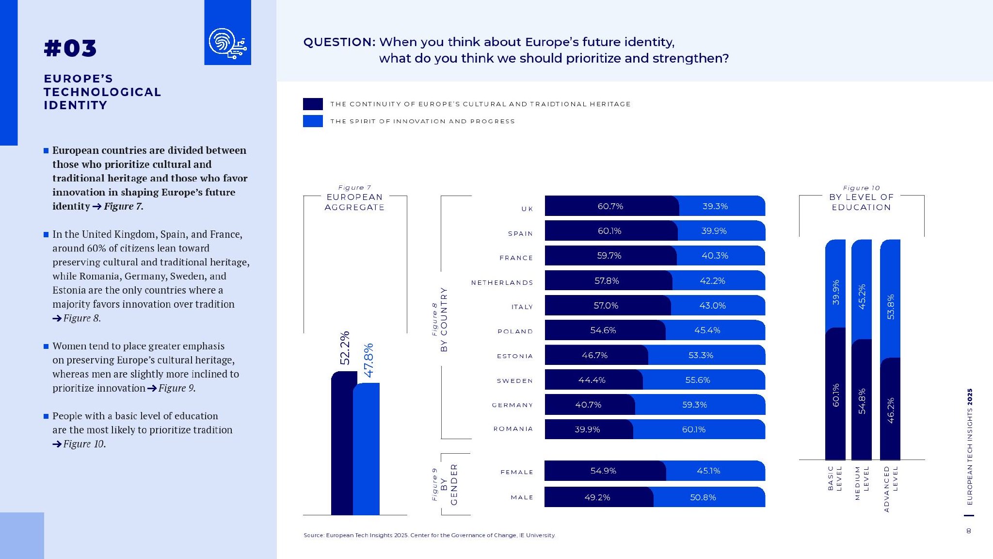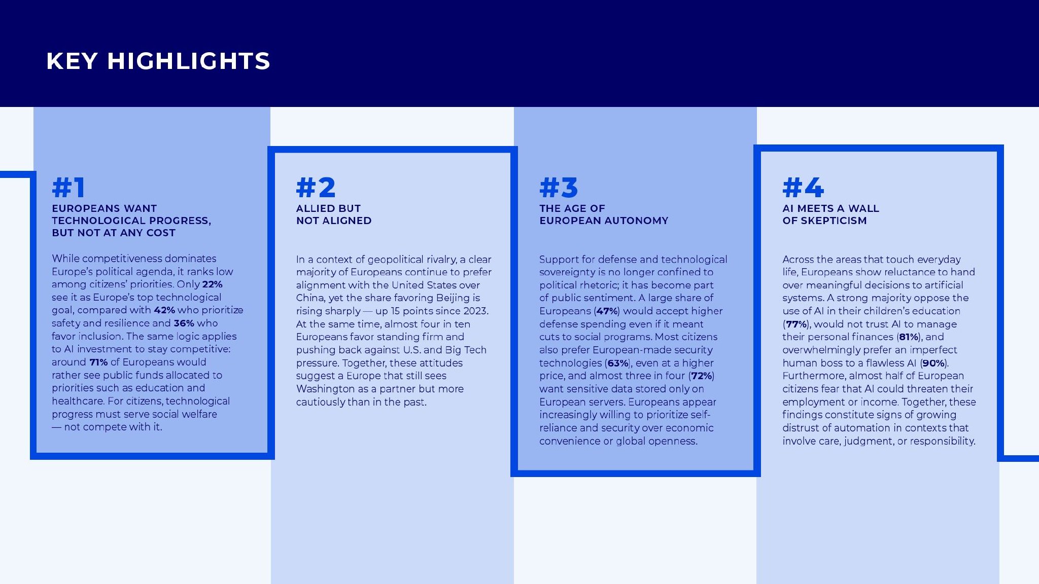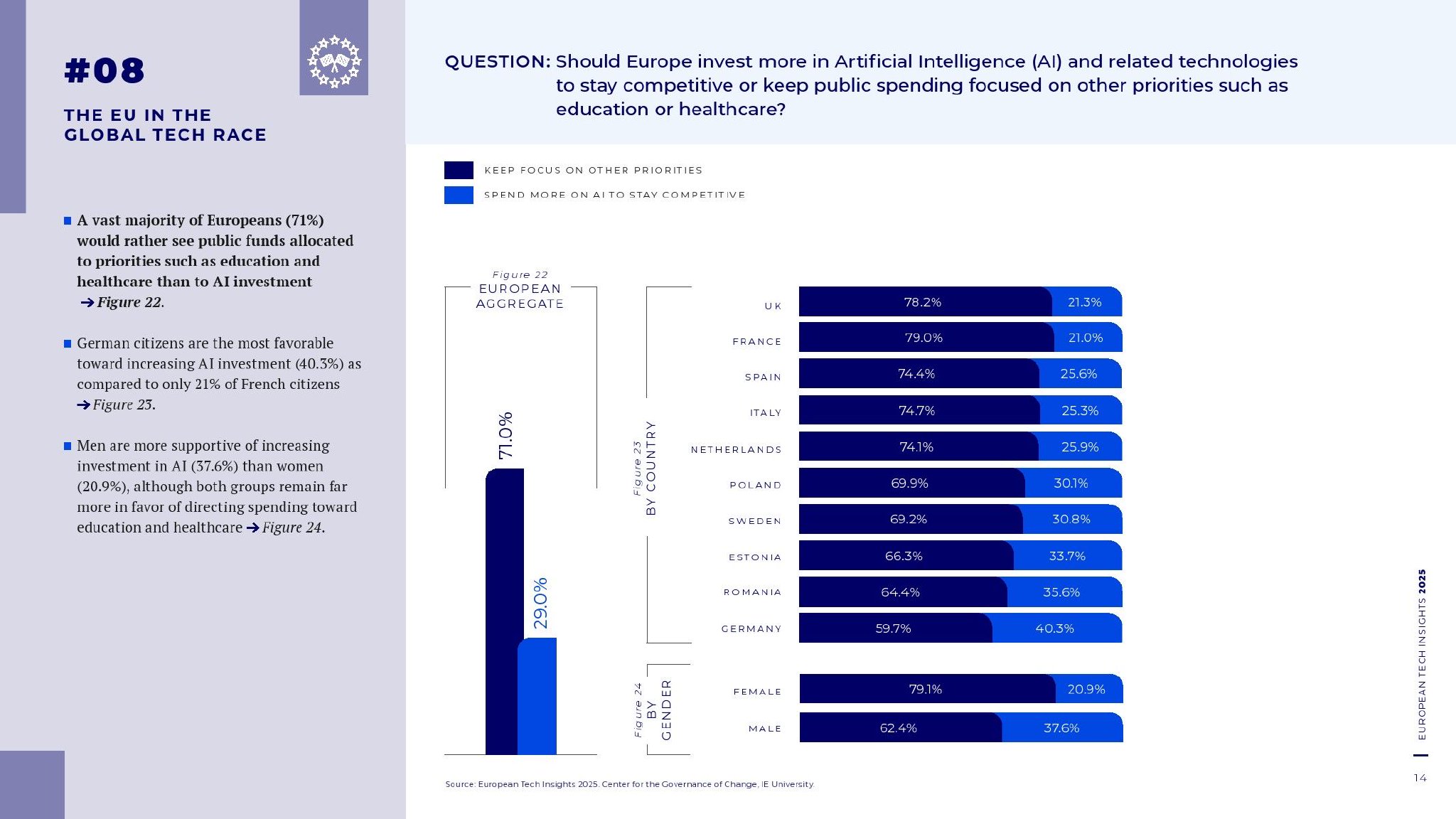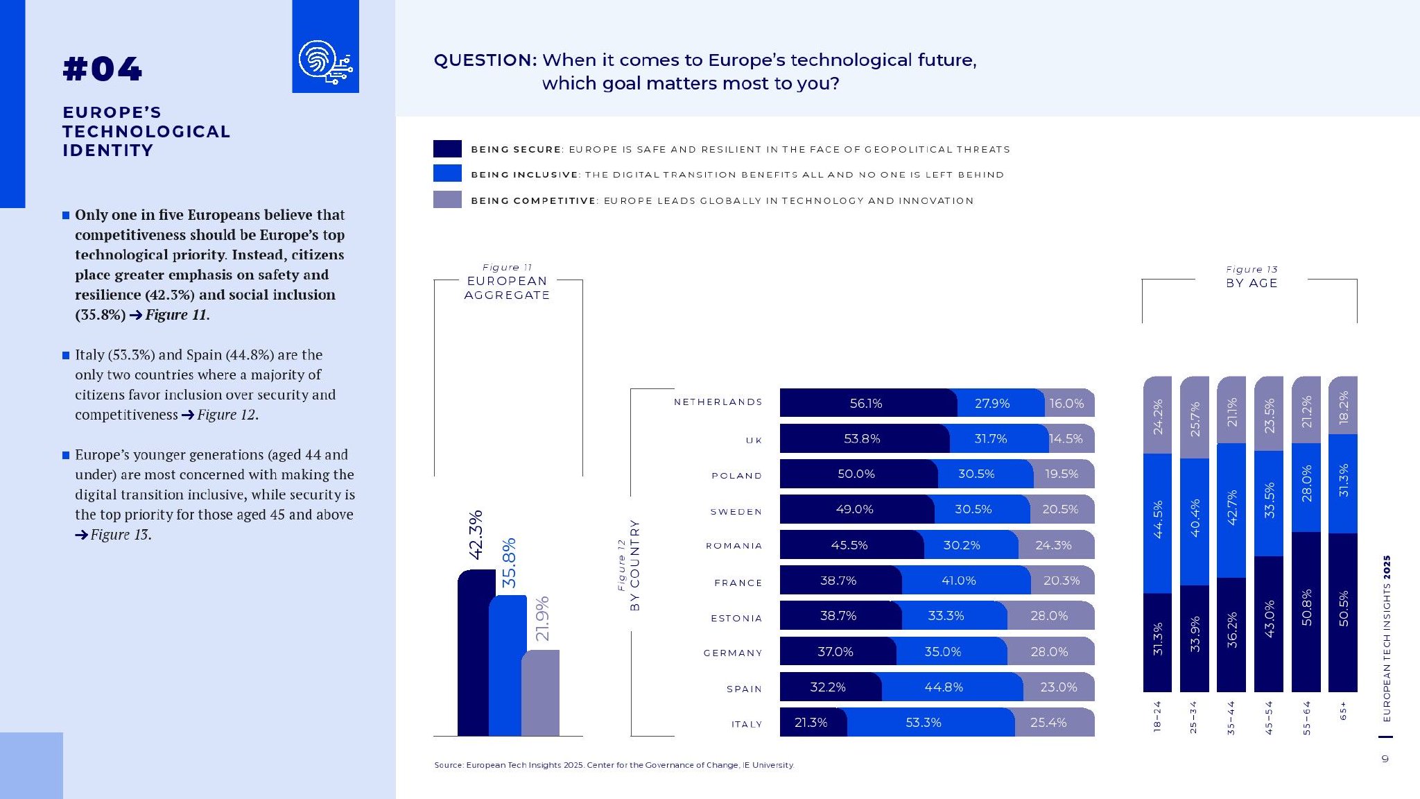 欧洲社会对技术进步的态度呈现出明显的“有条件接受”。报告显示,仅有21.9%的受访者将“全球竞争力”视为首要目标,而42.3%更重视安全与韧性,35.8%强调社会包容。与此同时,71%的欧洲人更倾向将公共资金投入教育与医疗,而非AI等前沿技术投资 。这表明,在宏观政策层面,技术已不再被视为增长引擎本身,而必须服务于社会福利与公共价值。