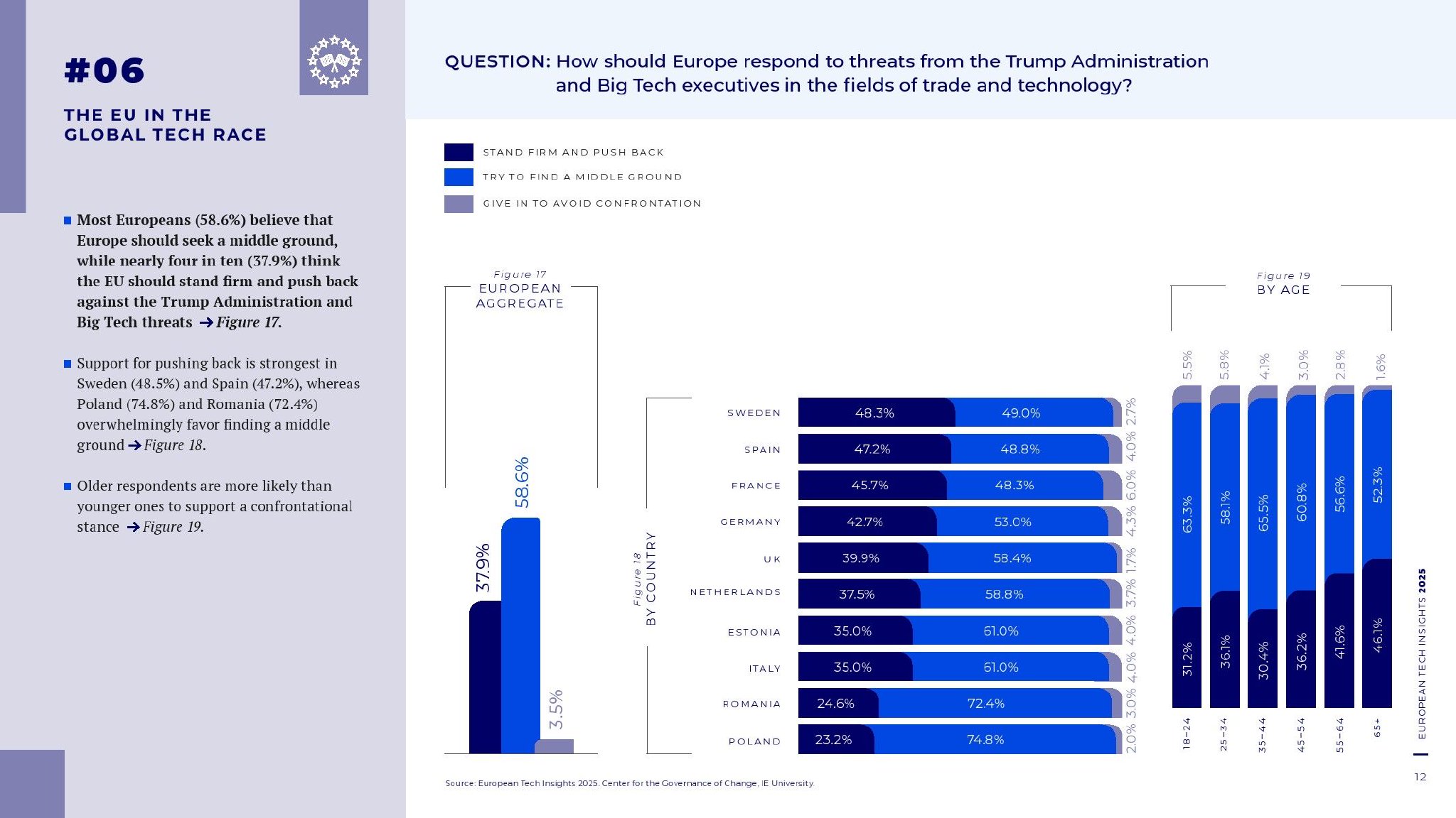 地缘政治维度上,欧洲态度正趋于复杂化。一方面,仍有71%的欧洲人倾向与美国保持一致,但支持中国的比例已升至29%,较2023年上升15个百分点 。同时,37.9%的受访者支持对美国及科技巨头采取更强硬立场 。这一“盟友但不完全对齐”的态势,反映出欧洲在大国竞争中试图提升战略自主性。