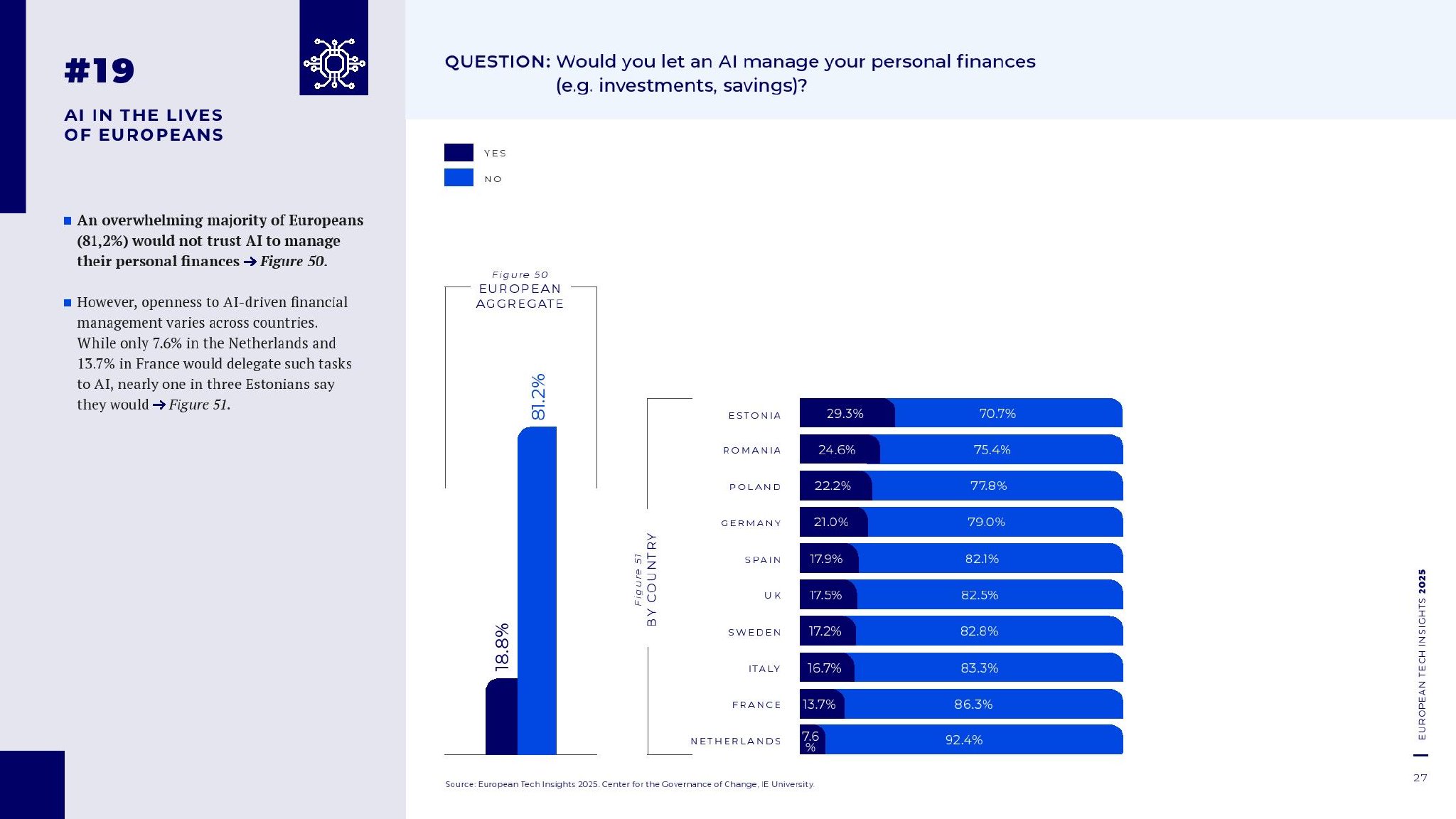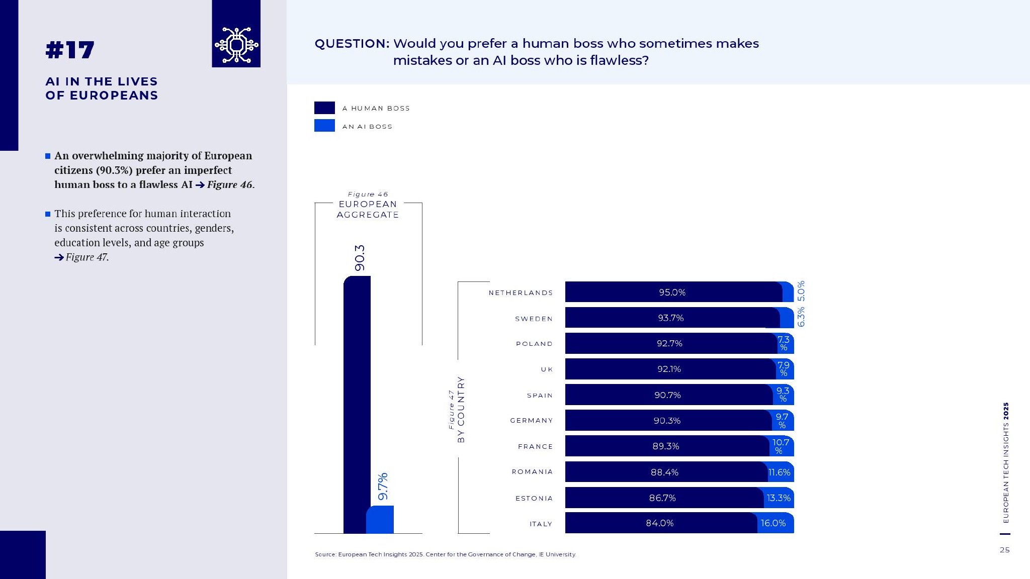在人工智能领域,欧洲呈现出显著的信任赤字。90.3%的受访者更倾向选择“会犯错的人类领导者”,而非“完美的AI” 。77.2%反对在儿童教育中引入AI,81.2%不愿让AI管理个人财务 。尽管54.6%认为AI可提升工作效率,但仍有45.4%担忧其威胁就业 。这种“效率认可与信任缺失并存”的结构,构成AI普及的核心阻力。