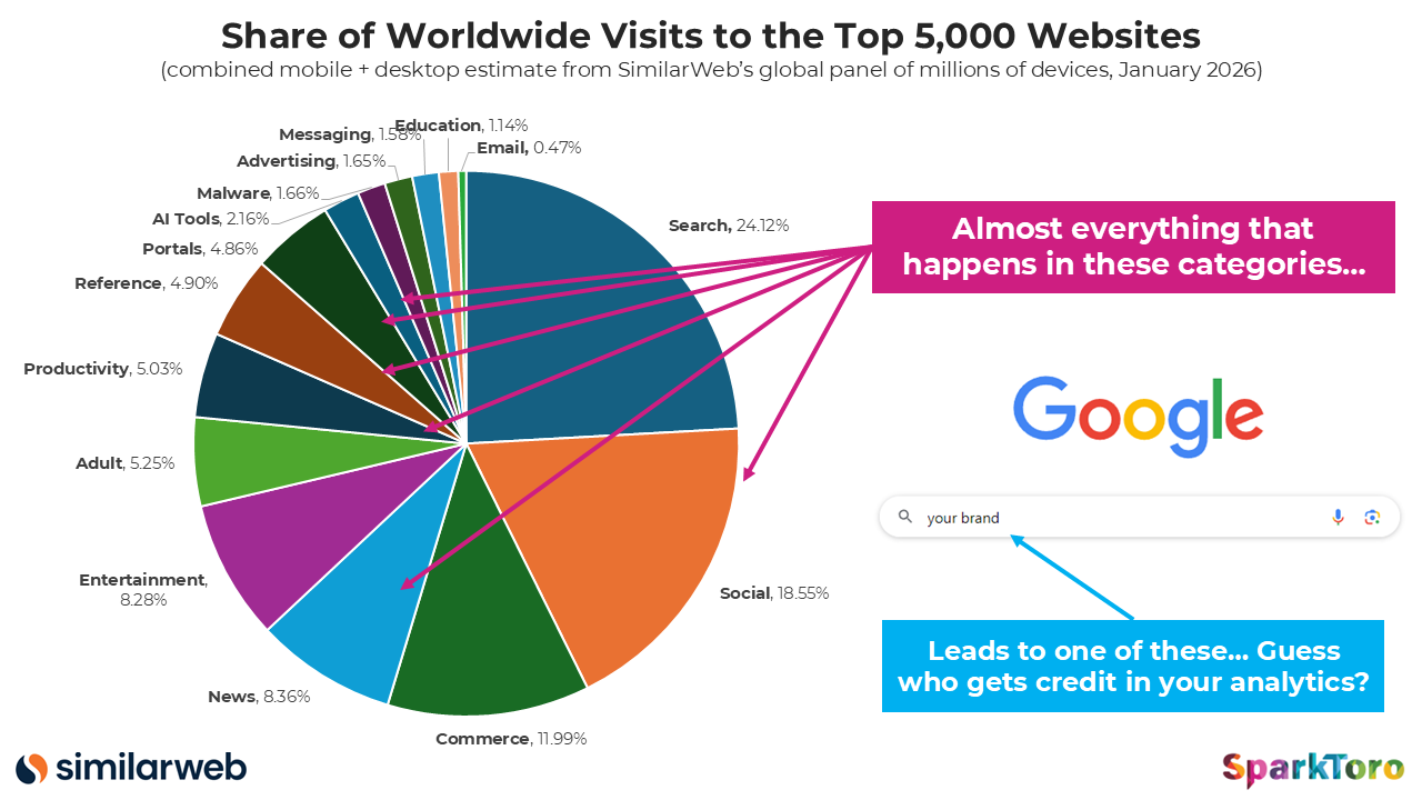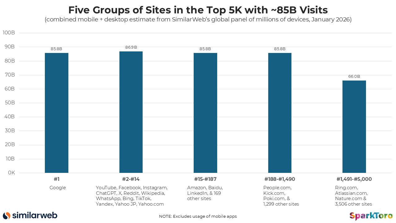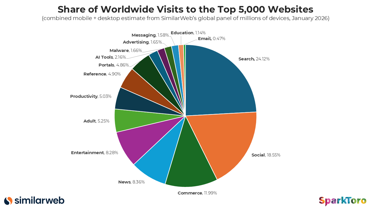 Similarweb与SparkToro基于2026年1月全球面板数据,对移动端与桌面端合并后访问量排名前5000的网站进行分类统计。结果显示,搜索引擎以24.12%居首,社交网络以18.55%紧随其后,商业网站占11.99%。前三大类合计已达54.66%,若再加上新闻出版8.36%和娱乐8.28%,前五大类合计达到71.30%。这意味着全球网页访问的流量分布,仍然高度集中在少数通用入口,且Google的规模几乎可与其后13个最大网站之和相提并论。