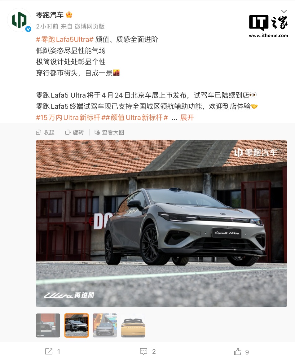 IT之家 4 月 13 日消息,零跑汽车宣布零跑 Lafa5 Ultra 将于 4 月 24 日北京车展上市。该车搭载专属运动套件,支持全国城区领航辅助功能,目前展车正陆续运抵各地门店。