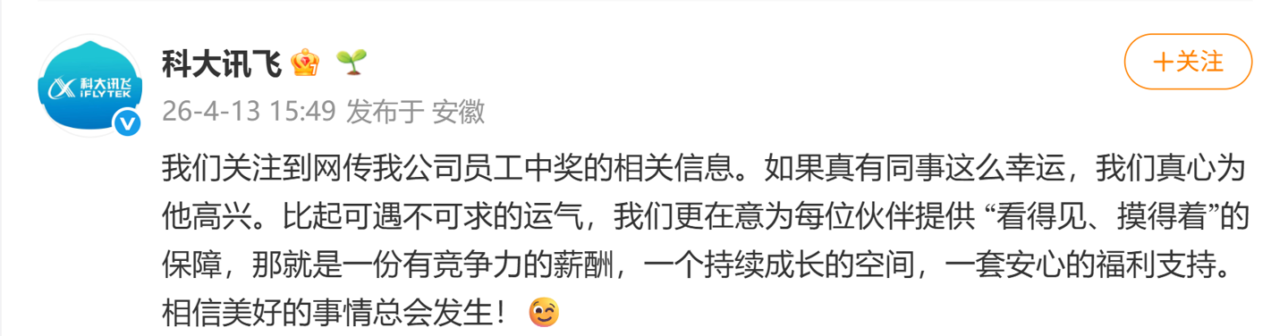 科大讯飞回应网传员工中 1000 万大奖:如果真有同事这么幸运,真心为他高兴