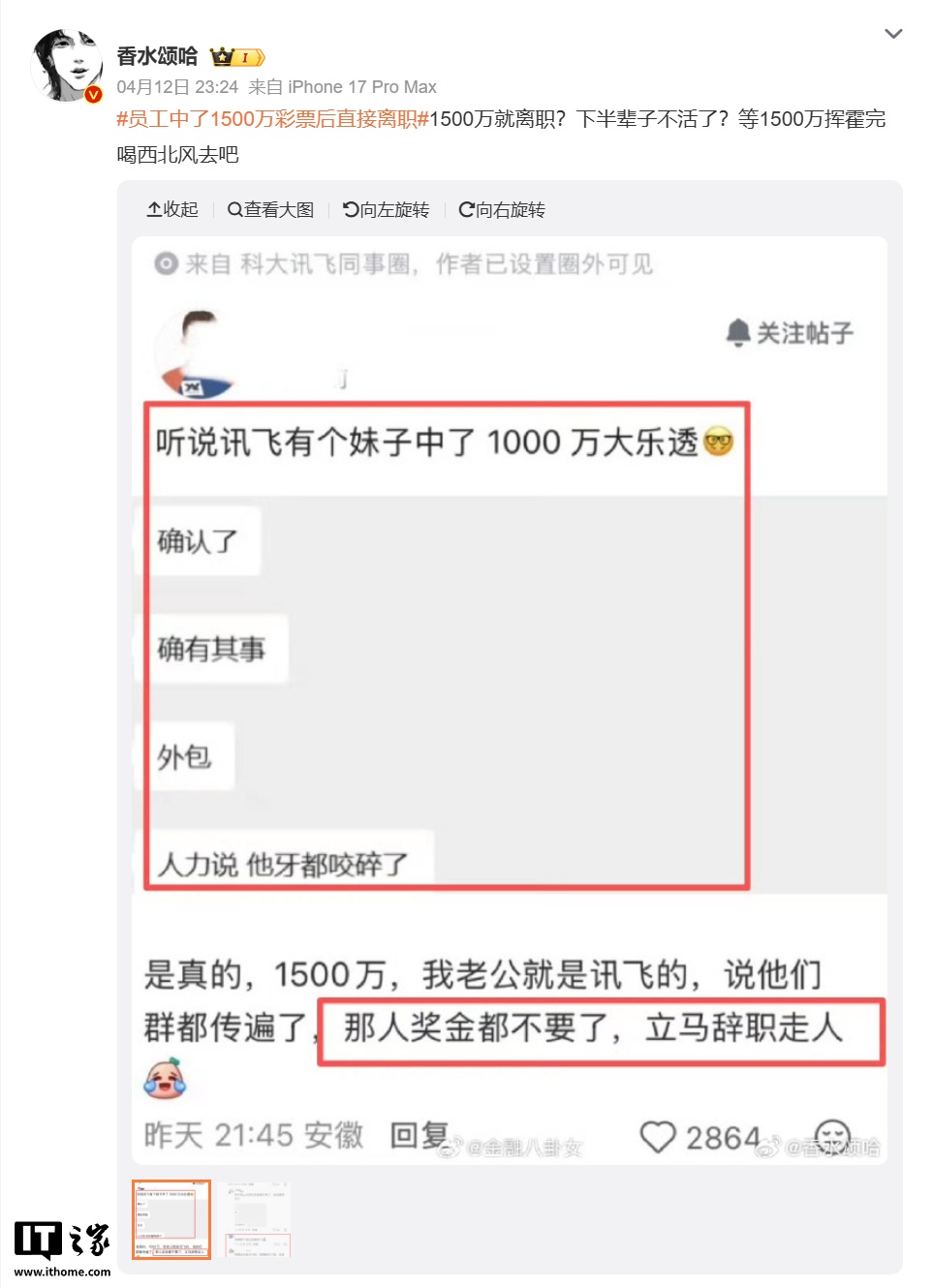 IT之家 4 月 13 日消息,近日,一则有关“科大讯飞员工中 1000 万大奖”的传闻在网络发酵,不过中奖金额并没有比较统一的说法。随后“员工中了 1500 万彩票后直接离职”等话题登顶微博热搜,截至IT之家发稿阅读量达 1.4 亿。
